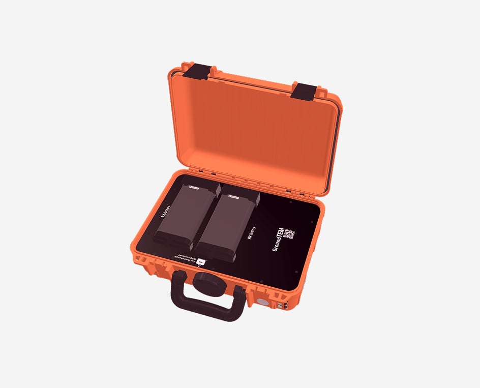 For the regular 20 m, 40 m and 80 m Tx configurations, the whole system ships in a single transport case, with integral wheels and handles. Arrive on site, open the case and the instrument, transmitter loop, and receiver coil are ready to lay out. Power comes from two or three (GroundTEM i20) small Li-ion battery packs that mount inside the instrument case, removing the need for heavy, external 12 V batteries.
