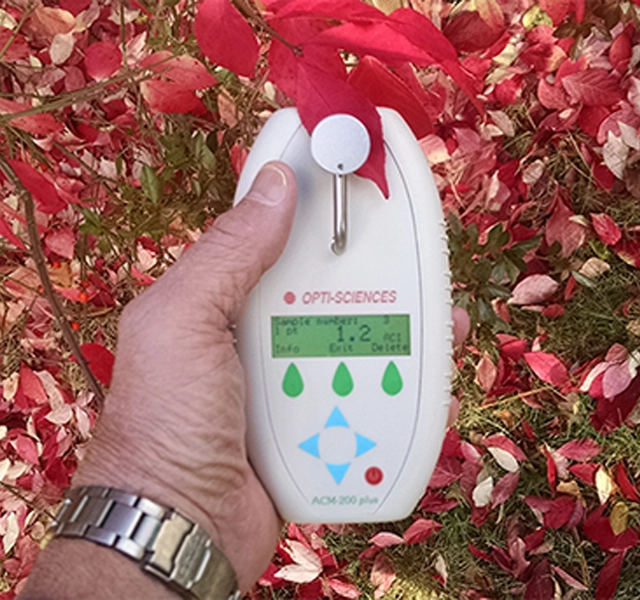 The ACM-200 plus Anthocyanin Content Meter provides an estimate of anthocyanin content on intact leaves of plants and flowers. The measurement is rapid, nondestructive, and simple to obtain, allowing researchers to gather reliable data that has been shown to correlate to chemical testing.