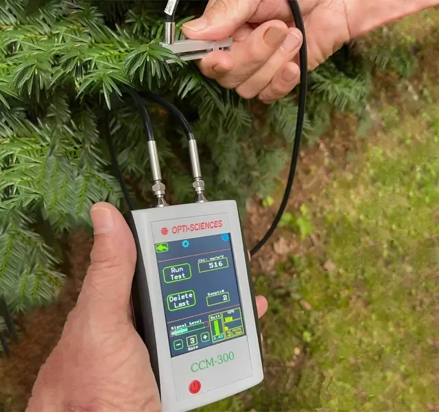 CCM-300  Chlorophyll Content Meter is designed to measure difficult samples. It can be used on conifers, turf grasses, moss, lichen, immature wheat, immature Arabidosis, stems, and petioles, as well as easier samples, like corn and broadleaf plants. The instrument was designed around research done by Gittelson, Bushman, & Lichtenthaler in 1999. The research shows that this method offers a larger reliable measuring range than absorption style meters, provides a ratio that correlates with chemical tests & provides direct readout of chlorophyll content in mg/m2, that is reliable for many plant species. Adjustments to the direct chlorophyll content readout equation are possible for other species.