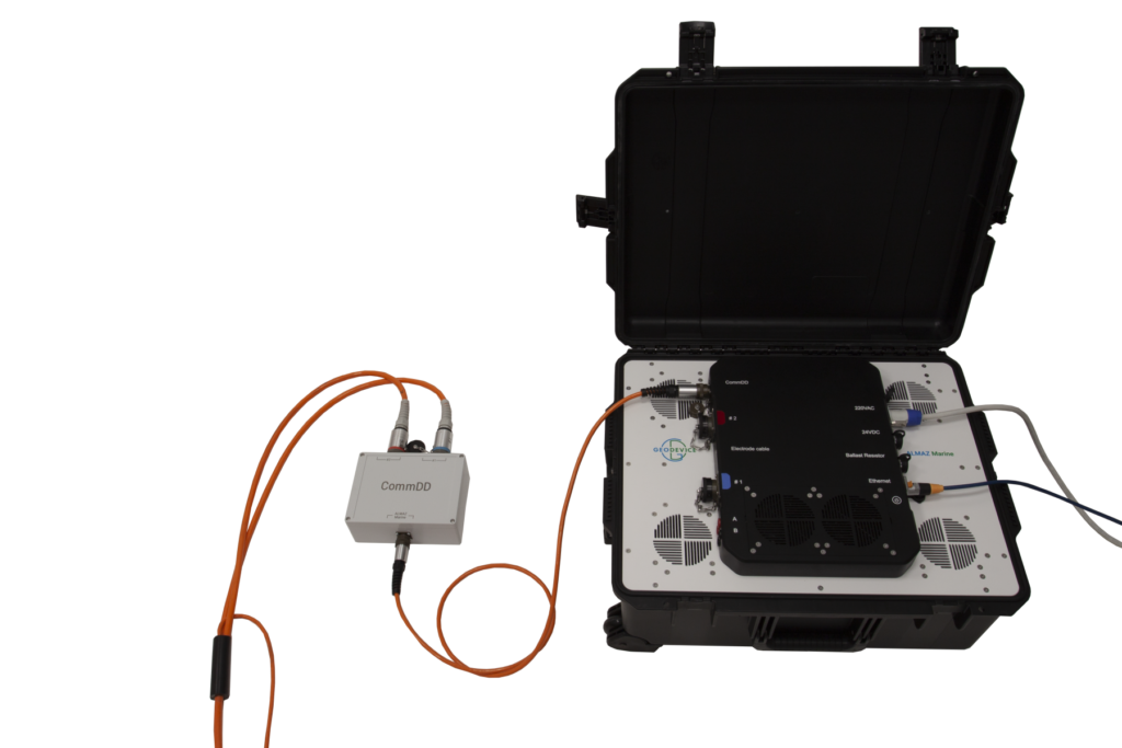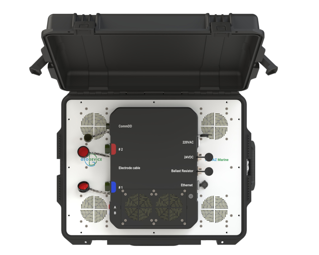ALMAZ Marine is the most modern system in the World for performing continuous aquatic sounding on DC or recording EM processes with 72-electrode towing array. A unique 3 kW generator allows using current up to 10 A, and when using an external DC source, 50 A current switching is available (optional). The built-in switchbox is designed to select one of three available array types. This approach, together with synchronous data recording on 32 channels, provides the highest possible resolution and depth of study achieveble with electrical tomography method – up to ~100-150 m (array with 5 m electrode spacing) both in fresh and marine water with a bottom depth of up to a few tens of meters.