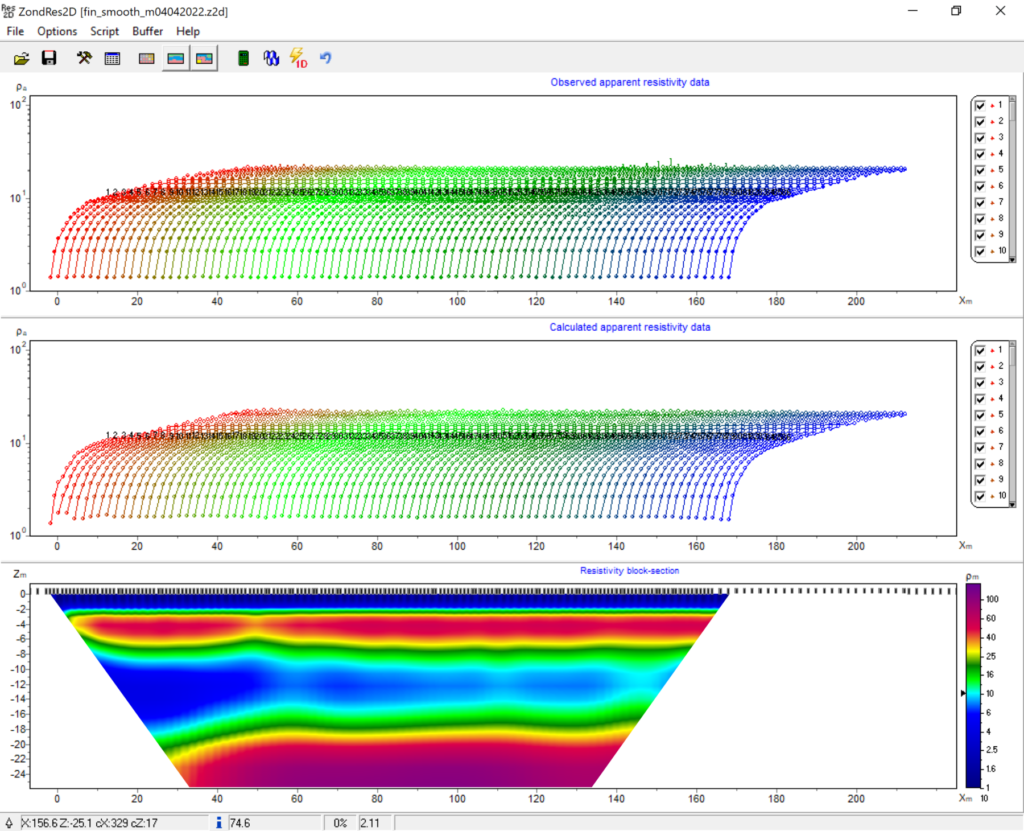 ALMAZ Marine supports two dipole-dipole and one gradient array. The first type is intended to get the best resolution and depth in freshwater areas or high resistivity water. Gradient array provides a significantly higher signal level at the receiver dipoles, so it is preferable in salty or heavily polluted (with resistivity starting from 0.2 Ohm∙m) water areas. Both arrays are designed to provide optimal data coverage of the pseudosection.