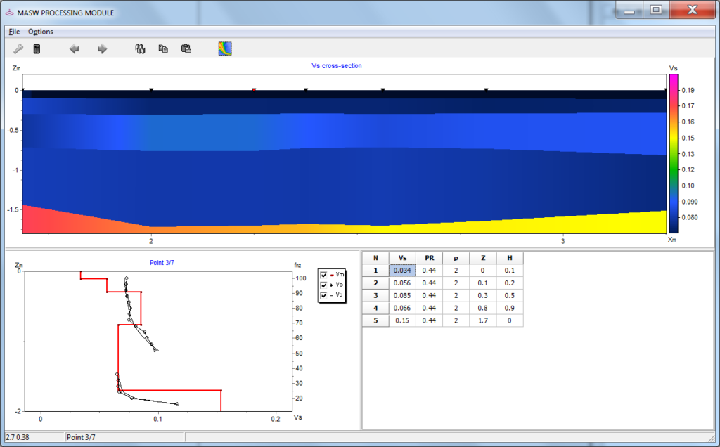 Multichannel analysis of surface waves utilizes Rayleigh wave dispersion properties to build Vs (shear wave) velocity profile up to 30 m depth for various geotechnical purposes. Ground roll strength on typical sledgehammer seismic record allows one to use its energy for MASW. General procedure for MASW processing includes dispersion curve calculation, fundamental and higher modes picking, followed by inversion. RadExPro has a dedicated MASW routine with user-friendly interface, which allows to perform all steps in a row up to final Vs section.
