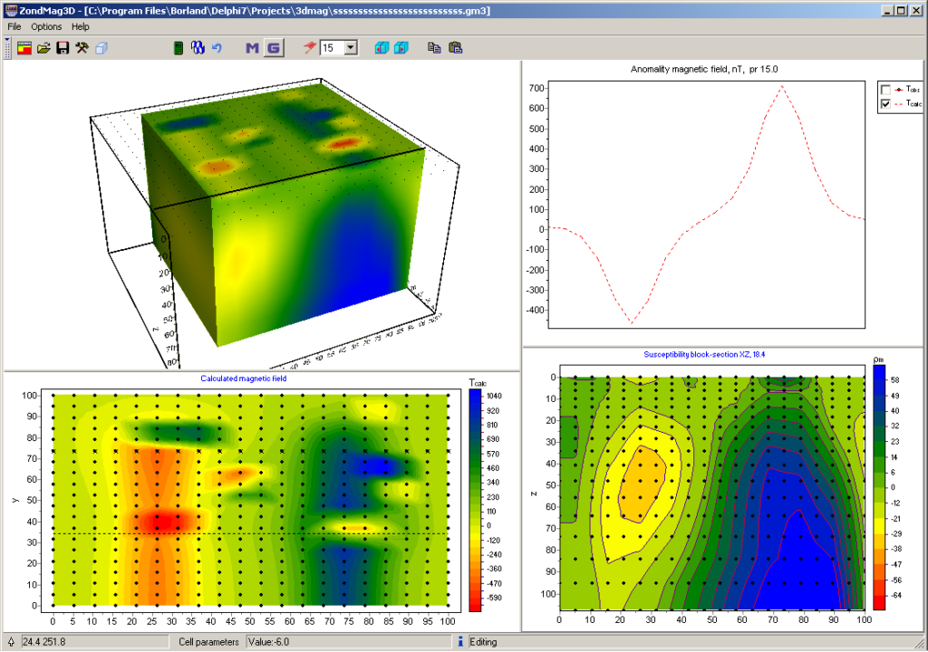 Calculations are made taking into account geomagnetic parameters of the study area, such as the declination and inclination of the magnetic induction vector, the value of the normal field, the magnetic susceptibility of the host rocks, the topography.