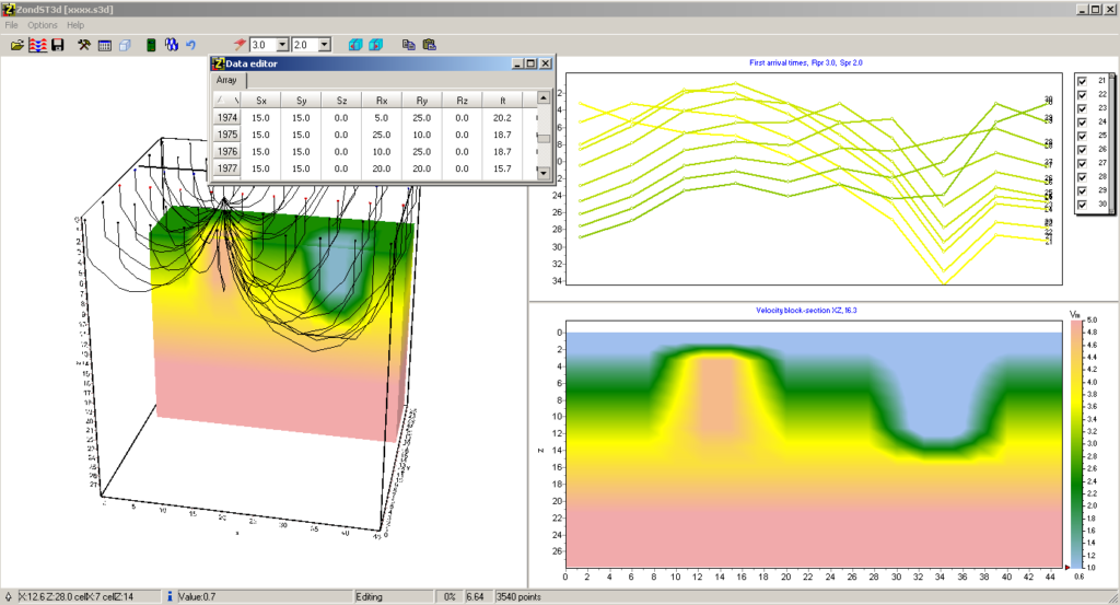 Important stage which prevents field measurement is mathematical modeling of velocity structure of work site. Modeling gives a chance to estimate the level of reflected waves first times and to make a choice of optimum parameters of the observation system for decision of formulated geological problem. ZondSt3d has great range of tools for mathematical modeling and analysis of first times field.