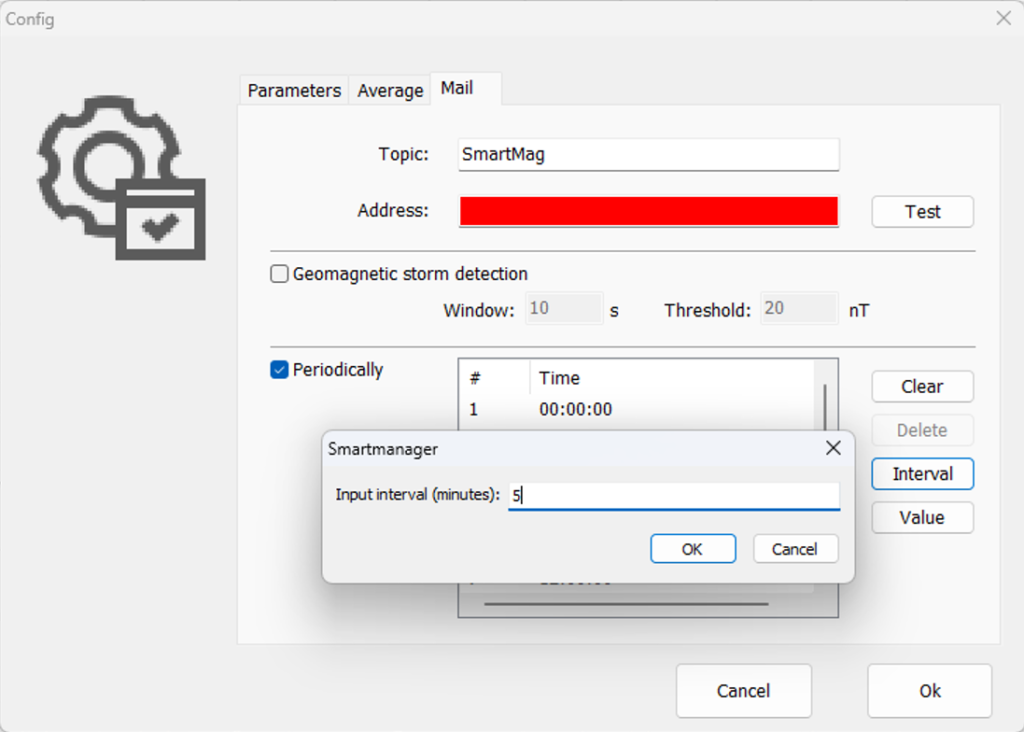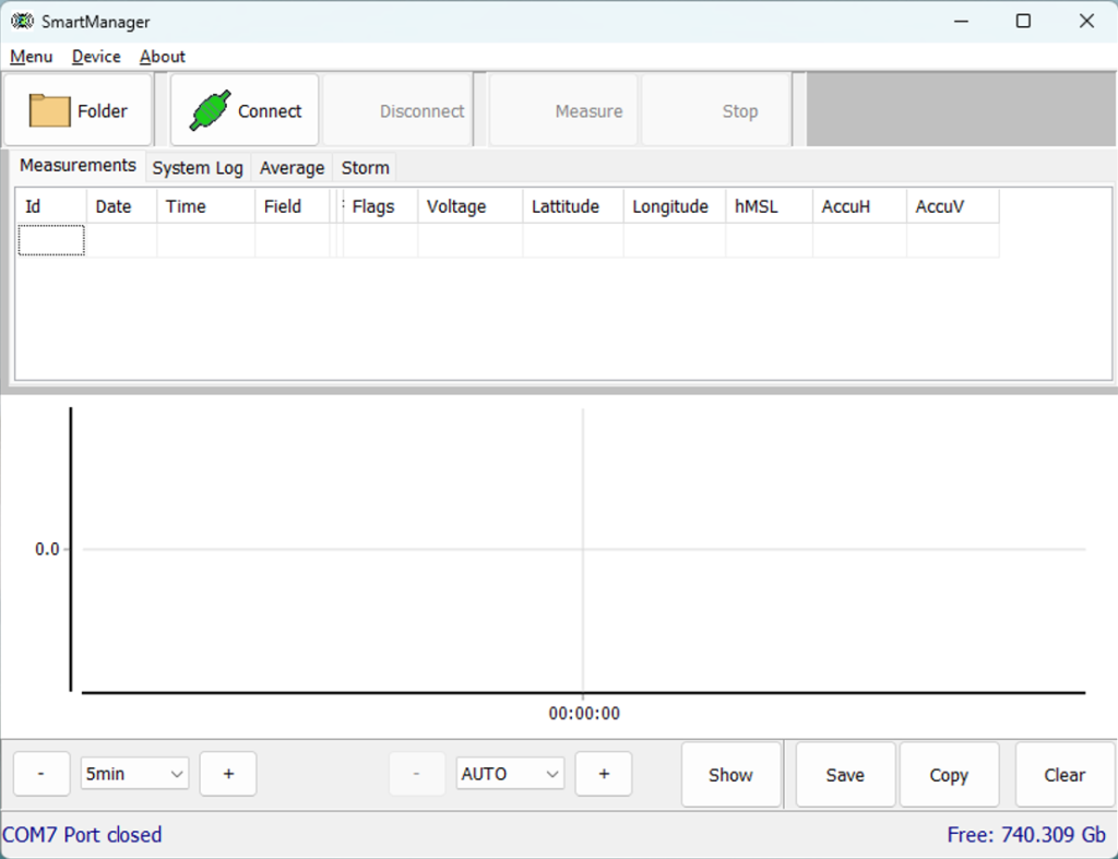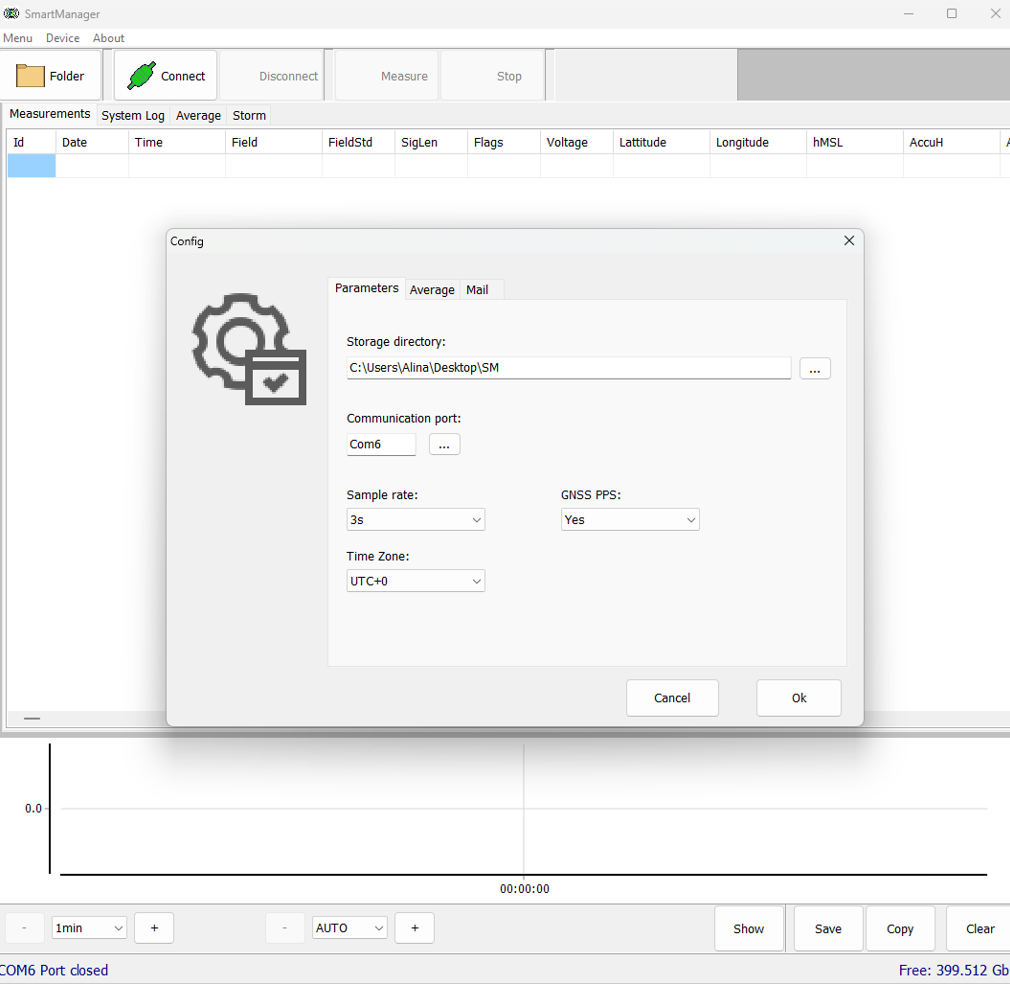 SmartManager provides recording of raw one-second and one-minute files in the IAGA-2002 format. These operational data can later be processed and saved into an IAGA provisional file. When generating one-minute files from one-second data, a 90-second wide Gaussian filter is applied, along with predefined thresholds to exclude low-quality measurements. The data can be automatically processed and sent to a specified email address. Upon user request, data transmission via GOES/METEOSAT satellites can also be configured.