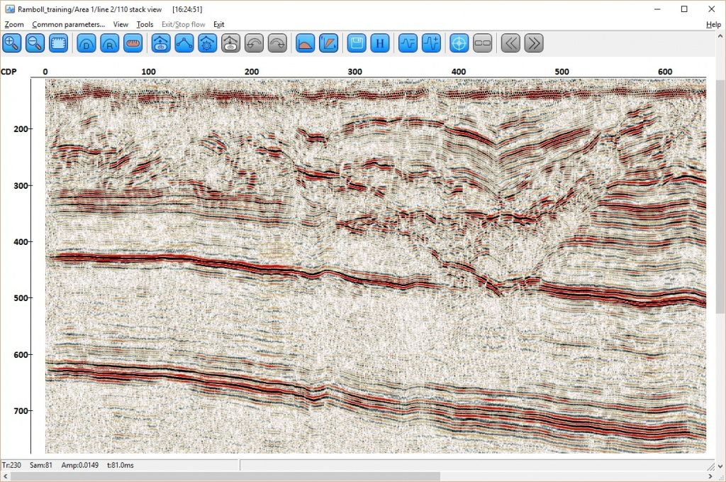 Processed CDP stack, acquired by reflection seismic method, data courtesy Ramboll