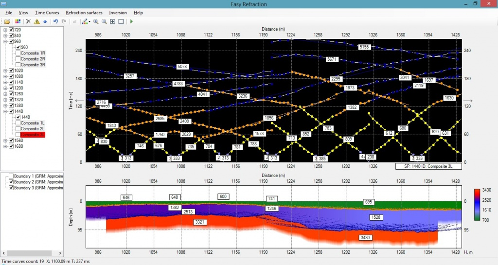 Refraction data processing using GRM: left – list of travel time curves and horizons, right top – branch assignment, right bottom – resulting geology section