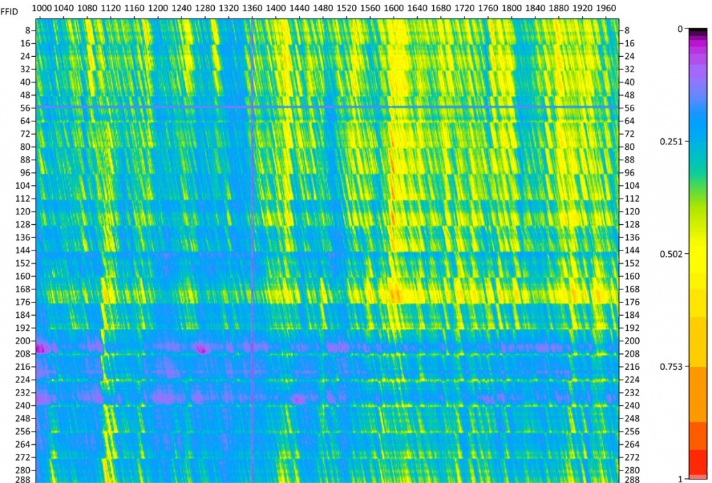 Real-time marine seismic QC – RMS attribute map. Vertical axis – channel number, horizontal axis -shot number. Purple lines indicates in both directions represent bad channel and shot correspondingly