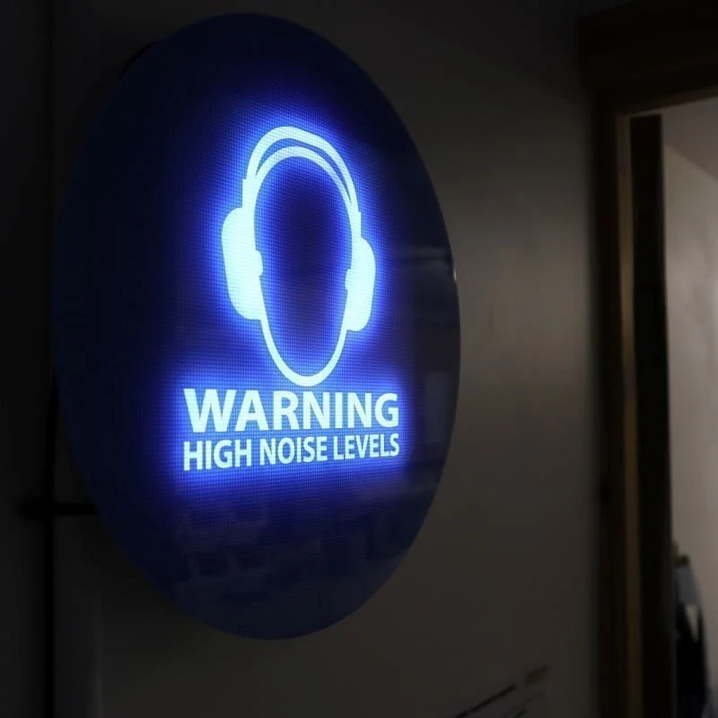 • Visual alert to employees to wear or remove hearing protection. The sign lights up when a preset noise level is exceeded