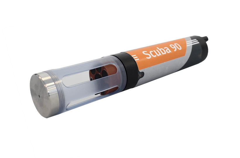 The Scuba 90 is an advanced, portable multiparameter water monitoring probe designed for long term deployment. It contains a central cleaning system to keep the fitted sensors clean and reduce the effects of biofouling common in extended deployments.